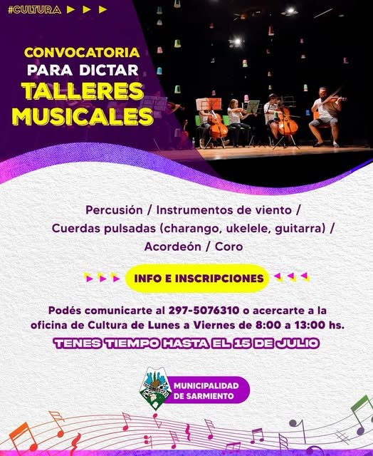 La Municipalidad de Sarmiento, a través del área de Cultura, convoca a personas interesadas en dictar talleres musicales en nuestra ciudad.